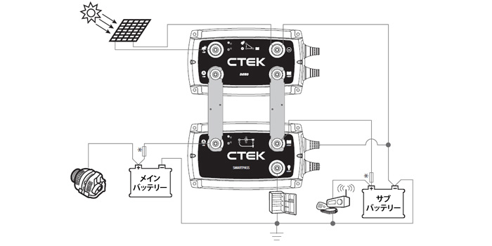 CTEK 走行充電器 D250SE+SMARTPASS120Sはサブバッテリーへの充電電圧を14.2Vまで昇圧して充電することで走行充電だけでリチウムイオンバッテリーをしっかり充電できます。